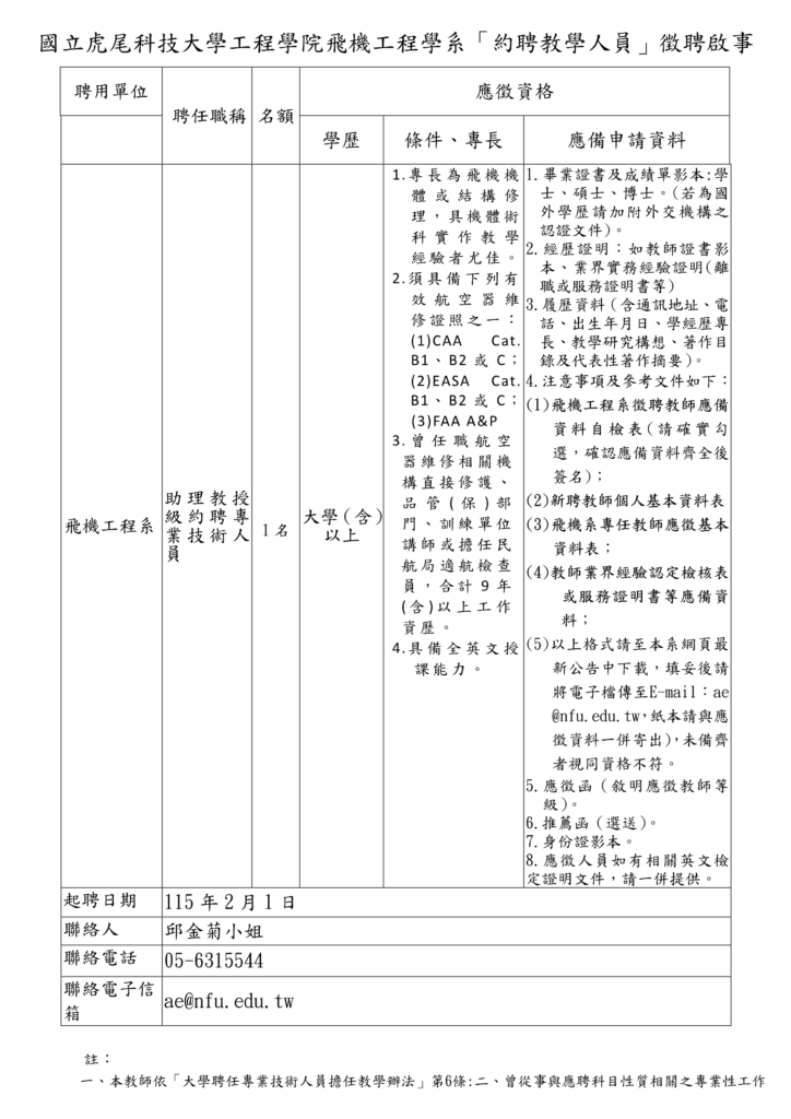國立虎尾科技大學飛機工程系徵聘教師應附資料自檢表下載