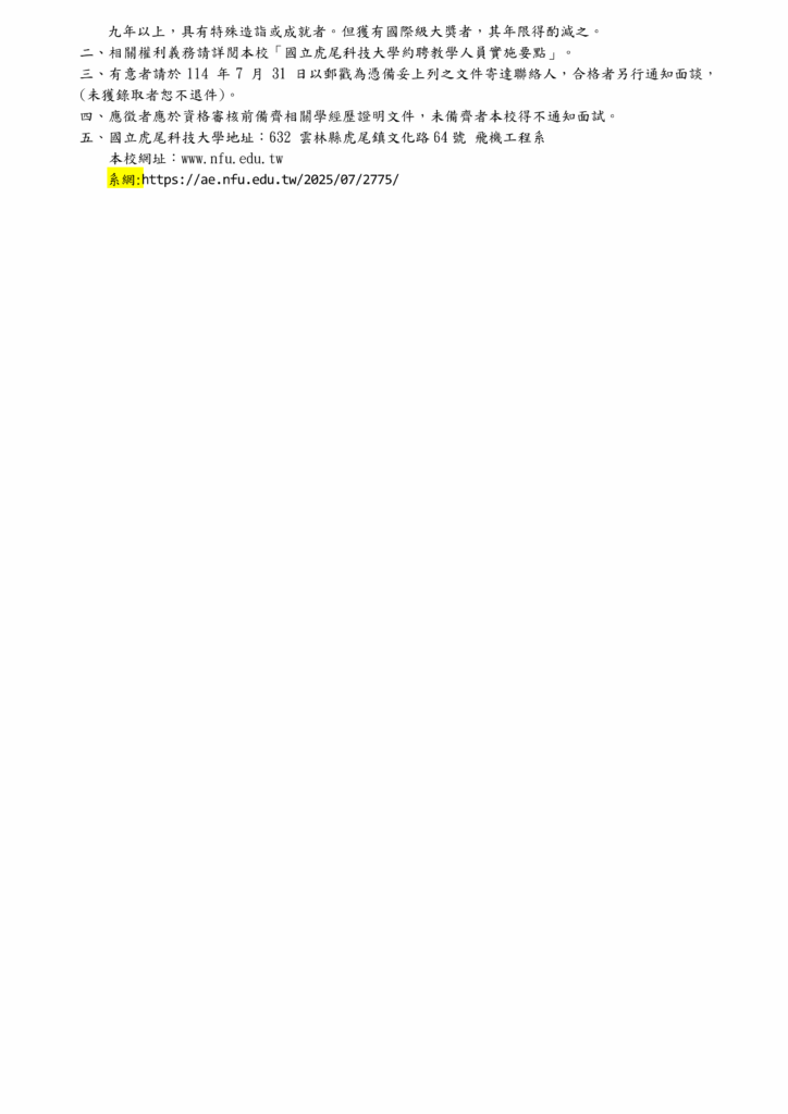【延長公告-新聘-專任教師(航電組)】114學年度第2學期徵聘專任教師1名(公告至114年7月31日截止收件,郵戳為憑)
