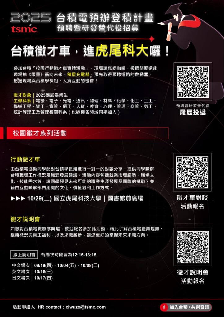 台積電 2025預辦登積計畫:預聘暨研發替代役招募–校園系列活動,開跑囉~